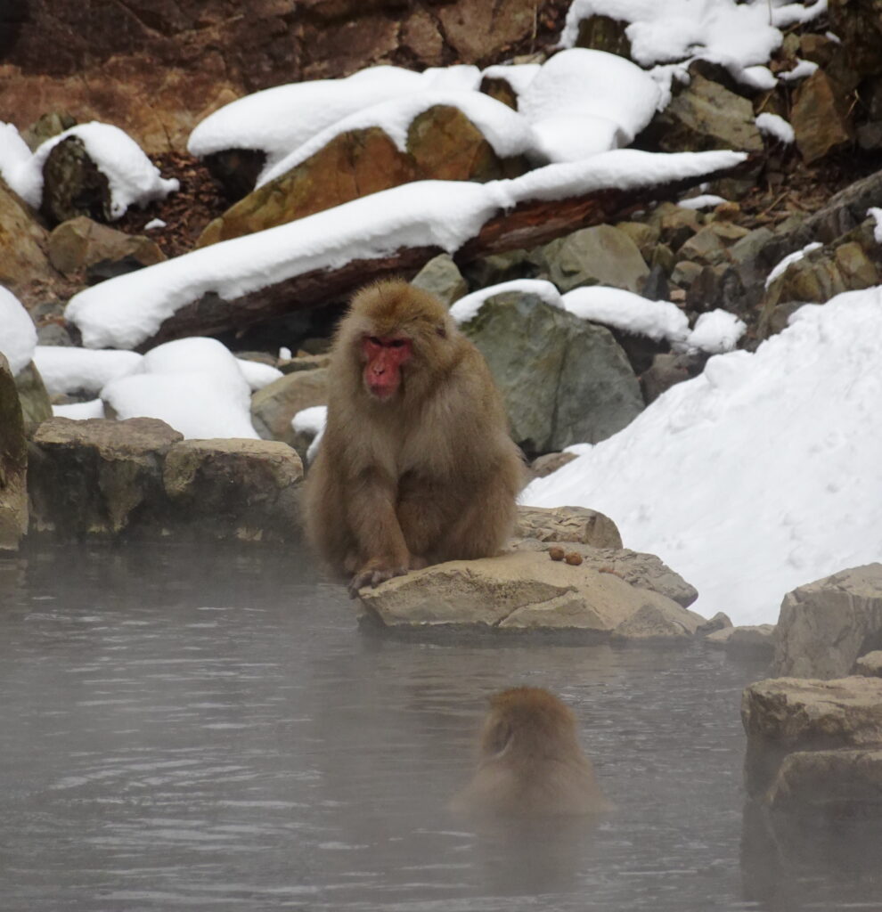 Van Nagano nemen we een lokale trein tot Yudanaka en vervolgens een bus tot aan het wandelpad van ongeveer een uur tot Jigokudani. Jigokudani, letterlijk de vallei van de hel. Het dankt zijn naam aan de stomende warmwaterbronnen die je er terugvindt. In deze natuurlijke bronnen komen de Japanse ‘sneeuwaapjes’ zich dagelijks baden.